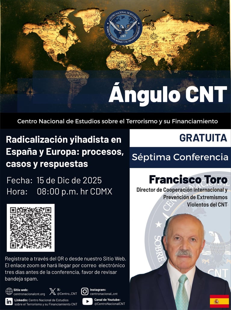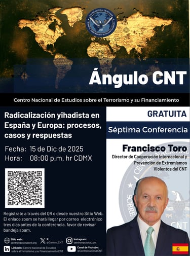 Ángulo CNT es el espacio de conferencias y análisis estratégico del Centro Nacional de Estudios sobre el Terrorismo y su Financiamiento, donde expertos internacionales abordan seguridad, inteligencia, investigación criminal, procuración de justicia, prevención, cumplimiento normativo y el estudio del terrorismo y su financiamiento. Dos veces al mes se realizan sesiones de alto nivel sobre terrorismo y amenazas híbridas —como delincuencia organizada, corrupción y narcotráfico—, además de una entrevista mensual con líderes reconocidos globalmente.