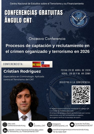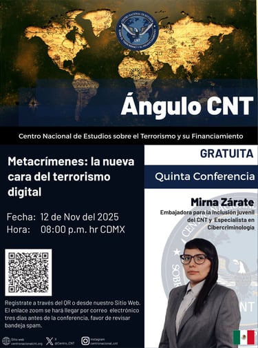 Ángulo CNT es el espacio de conferencias y análisis estratégico del Centro Nacional de Estudios sobre el Terrorismo y su Financiamiento, donde expertos internacionales abordan seguridad, inteligencia, investigación criminal, procuración de justicia, prevención, cumplimiento normativo y el estudio del terrorismo y su financiamiento. Dos veces al mes se realizan sesiones de alto nivel sobre terrorismo y amenazas híbridas —como delincuencia organizada, corrupción y narcotráfico—, además de una entrevista mensual con líderes reconocidos globalmente.
