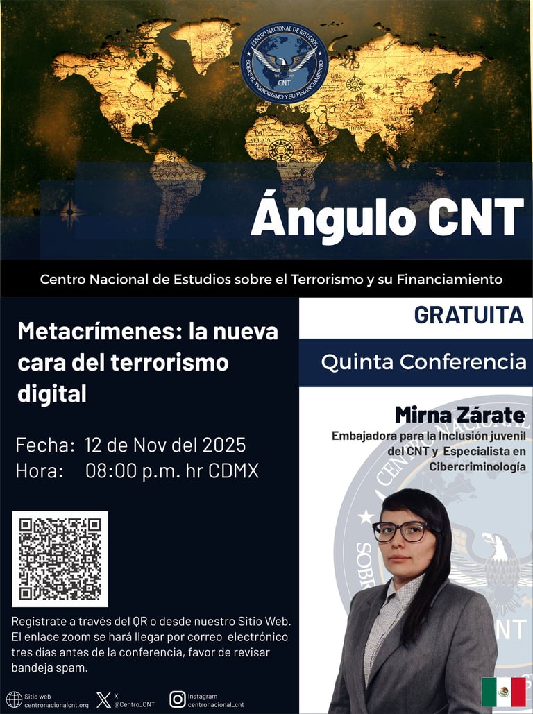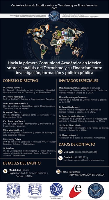 El Centro Nacional de Estudios sobre el Terrorismo y su Financiamiento (CNT) informa a su comunidad académica, aliados y participantes registrados que, debido a la suspensión de actividades académicas en la Facultad de Ciencias Políticas y Sociales de la UNAM, el evento programado para el 7 de octubre de 2025 será reprogramado.