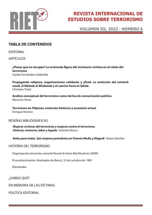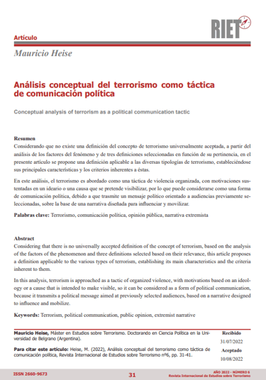 Heise, M. (2022). Análisis Conceptual Del Terrorismo Como Táctica De Comunicación Política . Revista Internacional De Estudios Sobre Terrorismo, Volumen Iii, 2022- Número 6 , Pp. 31–41. Recuperado De Https://Observatorioterrorismo.Com/Eedyckaz/2022/09/Numero-Completo-Riet-6.Pdf