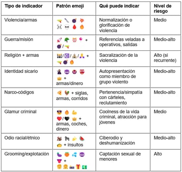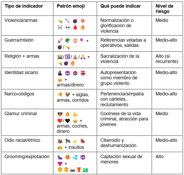 Dentro de este ecosistema digital, los emojis han surgido como instrumentos de comunicación codificada que facilitan a agrupaciones terroristas y criminales la evasión de algoritmos de moderación automática, la generación de indicadores de pertenencia grupal y la promoción del extremismo a través de tácticas de "jihadi cool" o la glamurización del crimen organizado.
