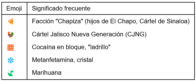 Cárteles mexicanos que usan emojis de comida como identificadores de facción (🍕 para "Chapiza", 🐓 para CJNG).